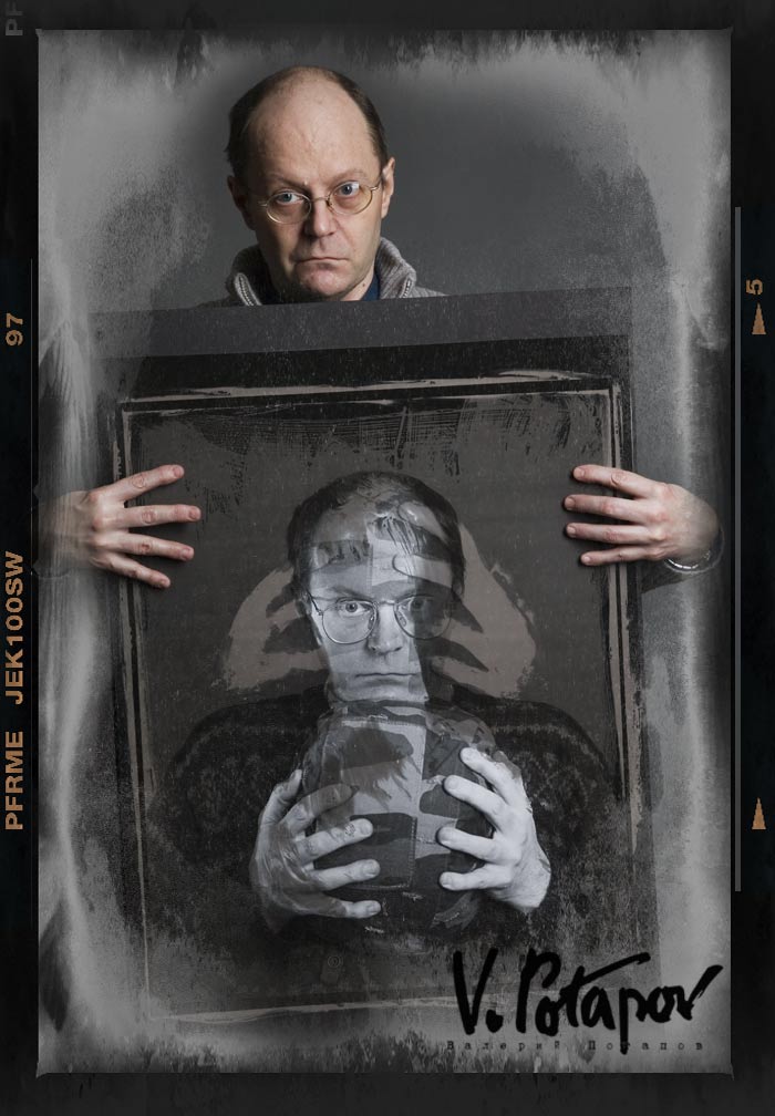 Было ощущение того, что подобное где-то видел. Курбановский предположил, что есть такой портрет Набокова - не, не помню. ...А вот, нтв-шная заставка с Киселёвым, когда-то давно, в зелёном тоне - была, и похоже... Он там тоже ручками шелудит, то ли с пенсне, то ли с очками.